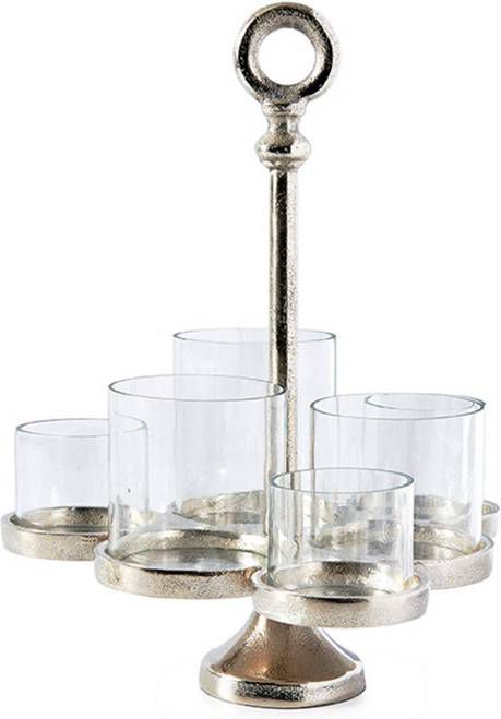Deze waxinelichthouder heeft een speelse uitstraling door de glaasjes van verschillende hoogte waar hij uit opgebouwd is. In ieder afzonderlijke glaasje kunt u in totaal zes waxinelichtjes kwijt. Het aluminium oog in het midden verbindt de glaasjes in de vorm van een driehoek. Dit oog is ook handig als u de houder wilt verplaatsen zonder uw vingers te branden aan het warme glaswerk.- Afmeting (lxbxh) 21x21x26 cm.